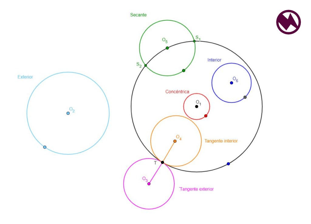 Tangente: Toca la circunferencia únicamente en el punto T. La distancia desde el centro O a la recta es igual que el radio r.