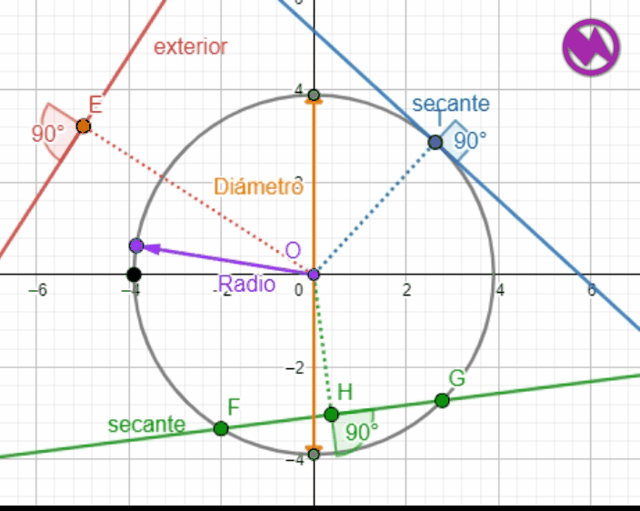 Secante: Toca a la circunferencia en dos puntos F y G. La distancia desde el centro O a la recta es menor que el radio r.