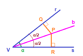 Una vez trazada la bisectriz b, si trazamos la perpendicular desde las rectas r y s a un punto P cualquiera de los puntos de la bisectriz, esas perpendiculares QP y RP mediarán lo mismo QP=RP.