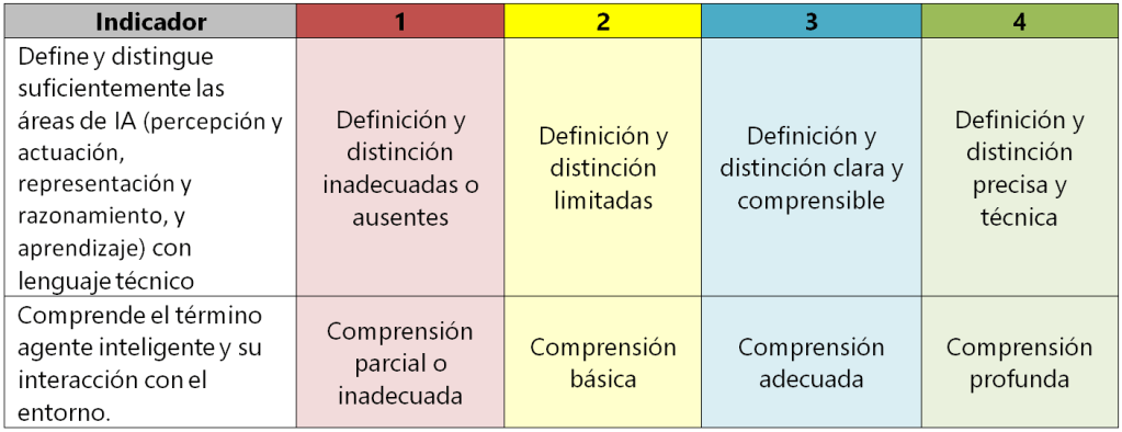 - 1: No cumple con los requisitos del criterio de evaluación.
