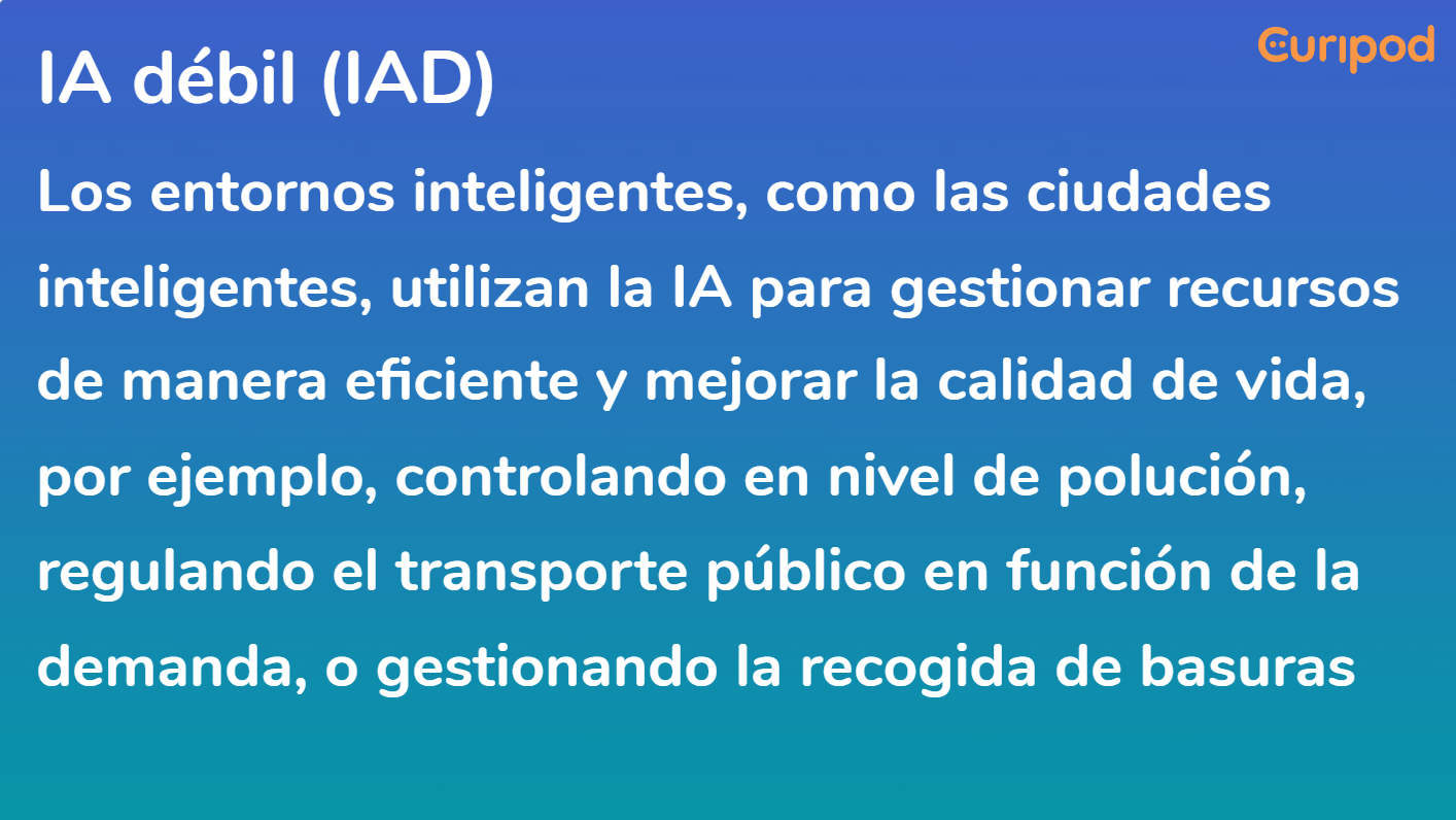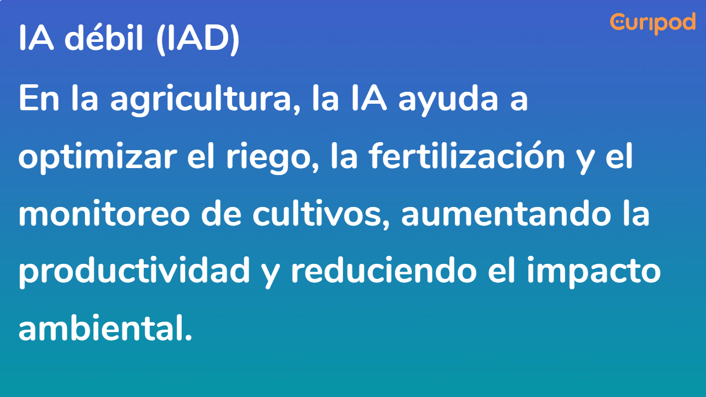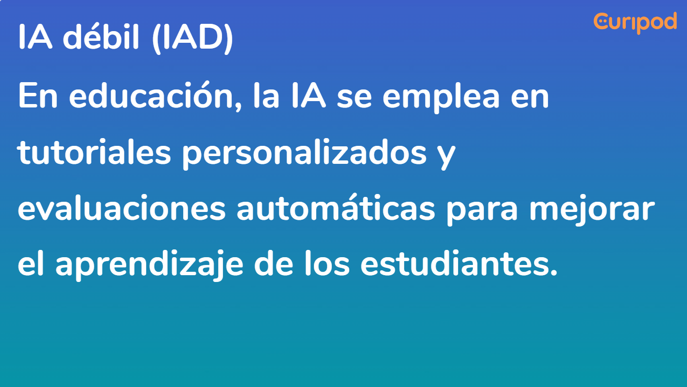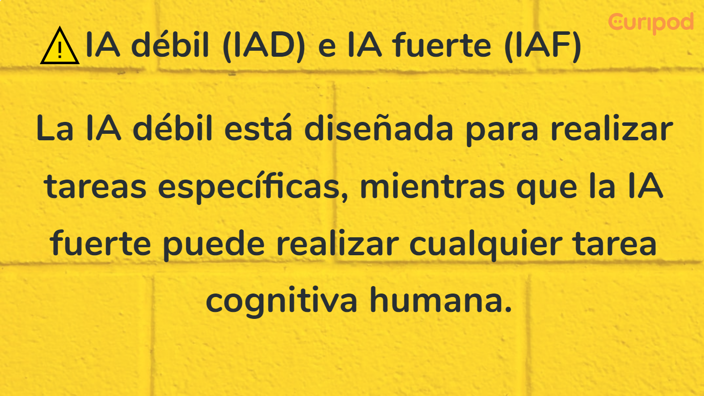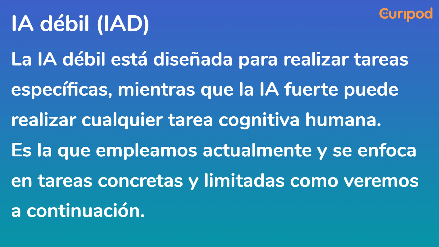 - IA Débil: Sistemas de IA diseñados para tareas específicas sin comprensión propia.
