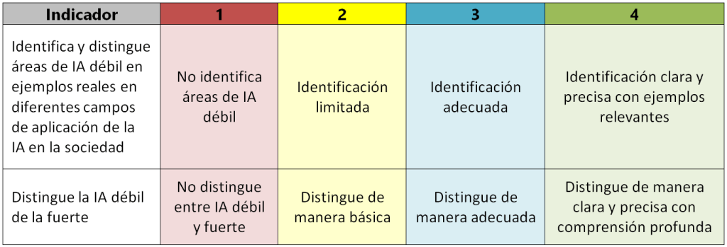 - 4: Cumple excelentemente con los requisitos del criterio de evaluación, mostrando un alto nivel de comprensión, habilidades de comunicación, trabajo en equipo (si procede), gestión del tiempo, proactividad, creatividad e innovación.