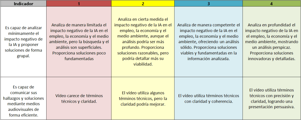 - 4: Cumple excelentemente con los requisitos del criterio de evaluación, mostrando un alto nivel de comprensión, habilidades de comunicación, trabajo en equipo (si procede), gestión del tiempo, creatividad e innovación.