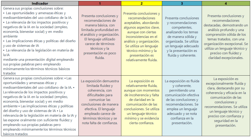 - 4: Cumple excelentemente con los requisitos del criterio de evaluación, mostrando un alto nivel de comprensión, habilidades de comunicación, trabajo en equipo (si procede), gestión del tiempo, creatividad e innovación.